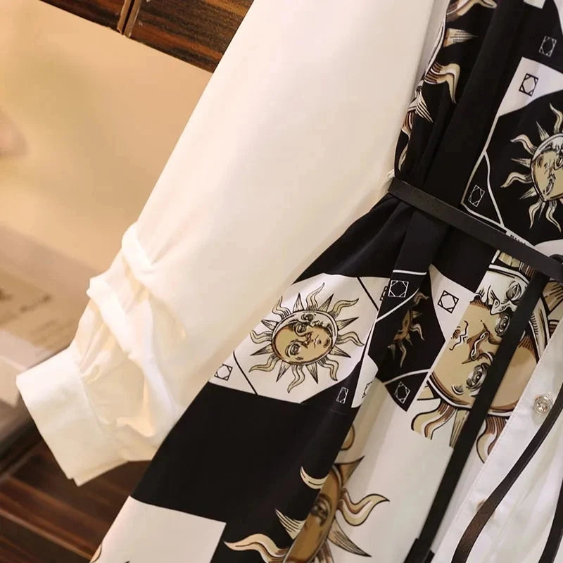 Vintage Print A-Line With Belt Loose Polo Neck Women's Dress Elegant Single-Breasted Knee Length Dresses For Women 2024 Spring