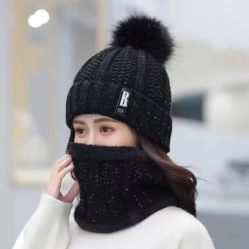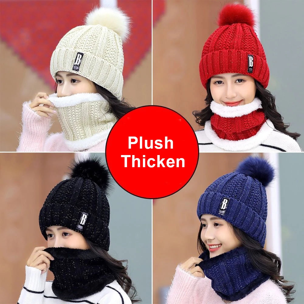 Winter Knitted Scarf Hat Set Thick Warm Skullies Beanies Hats for Women Solid Outdoor Snow Riding Ski Bonnet Caps Girl